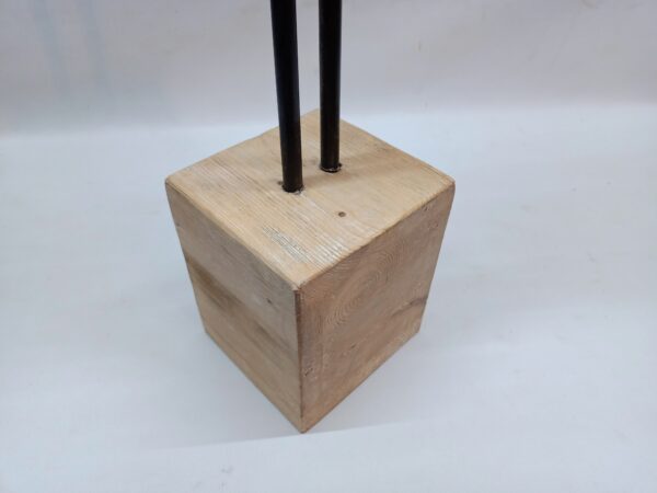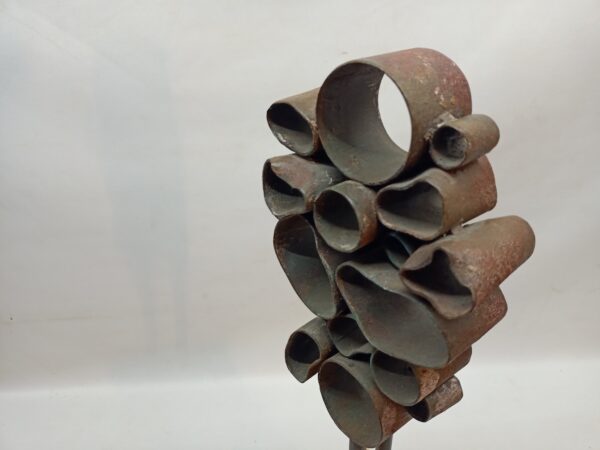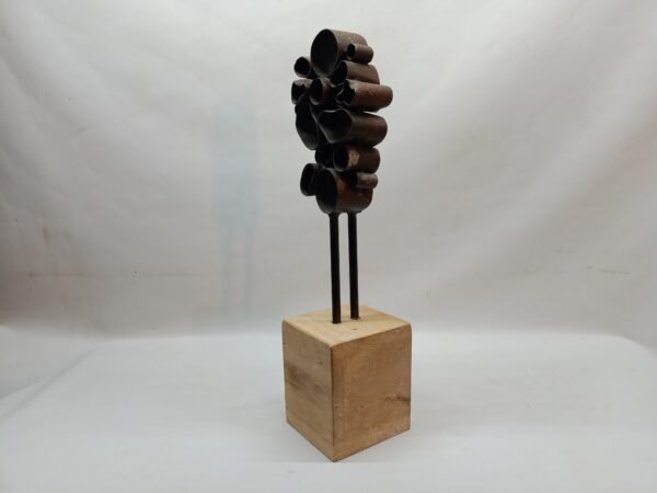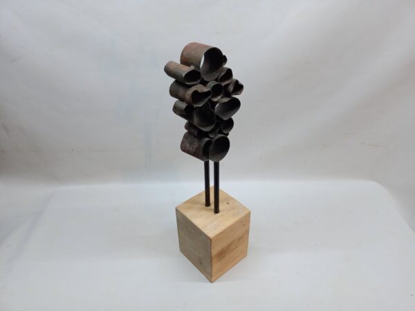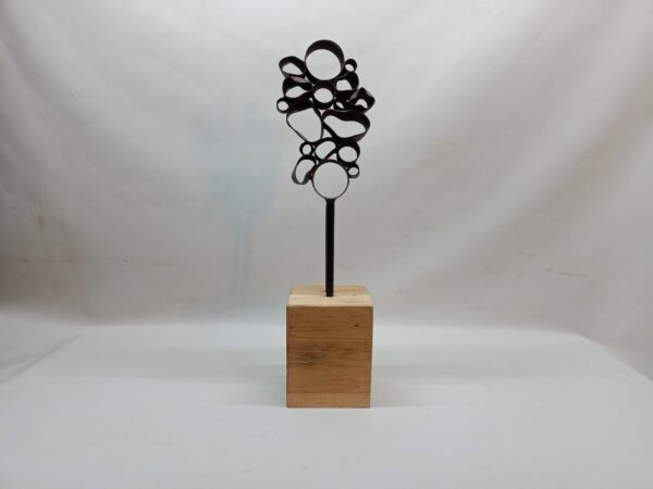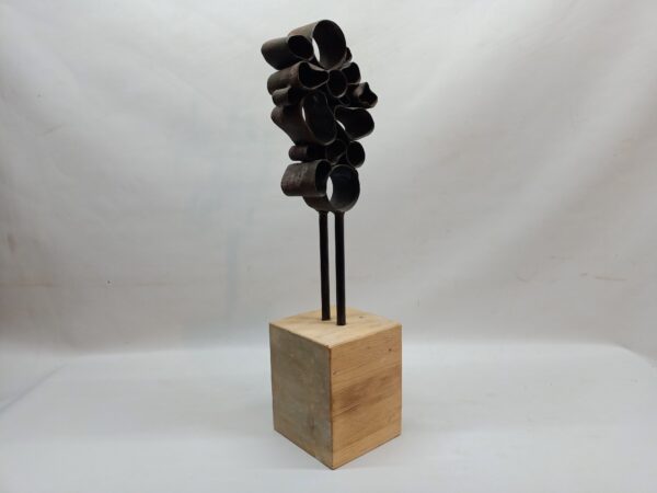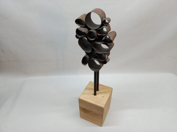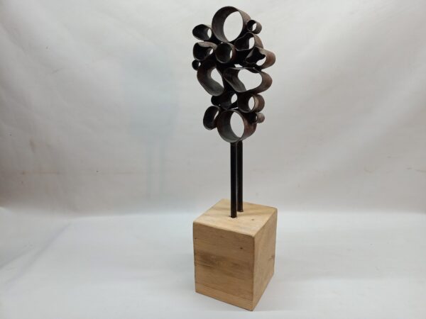 Esta escultura fusiona el frío metal con la calidez de la madera, creando una obra única y abstracta.