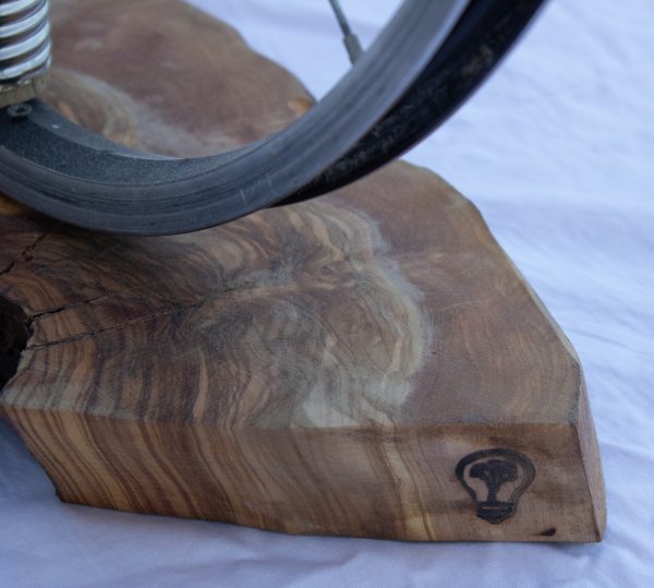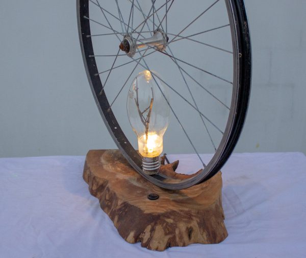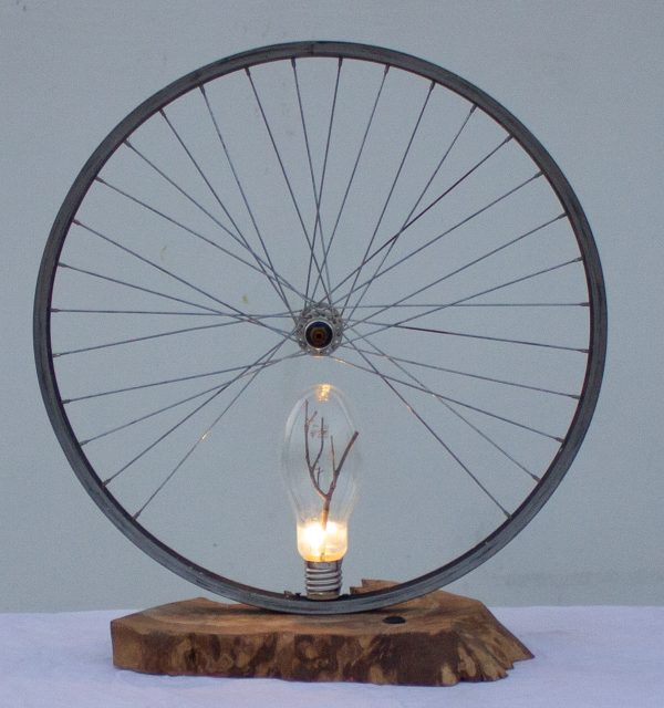 Upcycling de rueda de bici y bombilla farola sobre pie de olivo